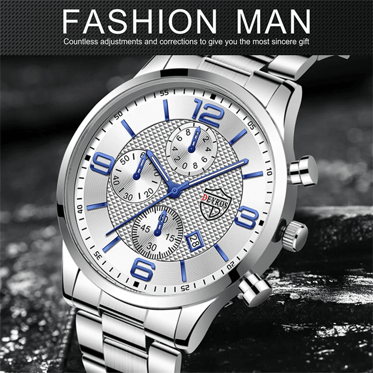 Fashion Men Watches, Luxury Silver Stainless Steel Quartz, Business Watch For Men, Calendar Clock silver Blue